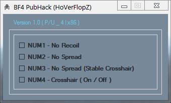 Kategorie: Battlefield 4 Entwickler: HoVerFlopZ Beschreibung: works only in x86 mode! Functions: NUM1 - No Recoil NUM2 - No Recoil (Normal) NUM3 - No Spread *Use this only in Hardcore* NUM4 - No Spread (Stable Crosshair) *Perfect for Softcore* Screenshots: Download: BF4 PubHack 1.3 |