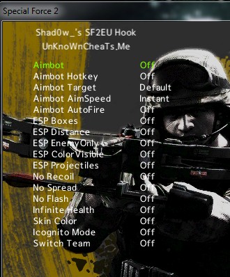 Kategorie: Special Force 2 Entwickler: Shad0w_ Beschreibung: Shad0w_'s SF2EU Hook Release Version 3 ------- Information This is a cheat is an unreal engine hook for the European version of special force 2 aka S.K.I.L.L. ------- Features Aimbot Aimbot Hotkey Aimbot Target Aimbot AimSpeed Aimbot AutoFire ESP Boxes ESP Distance ESP EnemyOnly ESP ColorVisible ESP Projectiles No Recoil No Spread No Flash Infinite Health Infinite Ammo Skin Color Icognito Mode Switch Team ------- Notes = Release 3 Changes = Infinite Health Icognito Mode Switch Team Skin Color improvements Auto Shoot update Xigncode module update = Release 2 Changes = Added No Spread. Added No Flash. Fixed the Aimbot Hotkey option. Added Skin Color option (scales with gfx settings). = Pre-Release Changes = Modified 'No Recoil' Method - may notice a slight difference in it's effect. Added temporary Menu until mine has been ported to UE3 engine. Screenshots: Download: SF2EU Hook R3 |